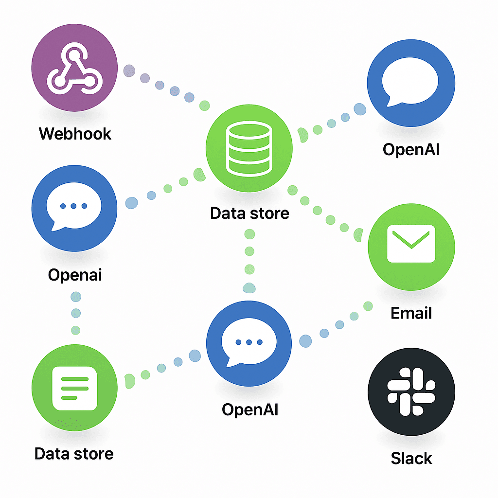 Powiadomienia: Slack, Gmail, Microsoft Teams, Brevo (Sendinblue).