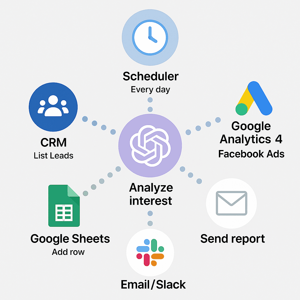 Automatyczna analiza zainteresowania ofertą dla deweloperów i agencji nieruchomości. Scenariusz pobiera zapytania klientów z CRM, łączy je z danymi o odsłonach i kliknięciach z Google Analytics 4 i Facebook Ads, a następnie wykorzystuje sztuczną inteligencję do oceny realnego poziomu zainteresowania. Raport jest codziennie zapisywany w Google Sheets i wysyłany e-mailem lub na Slack, dając pełny obraz skuteczności ofert.