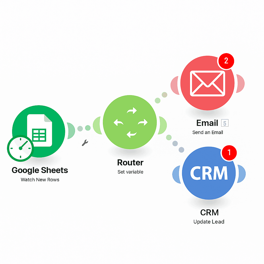 • 📊 Aktualizacja bazy danych (Sheets/CRM) po każdym kontakcie.