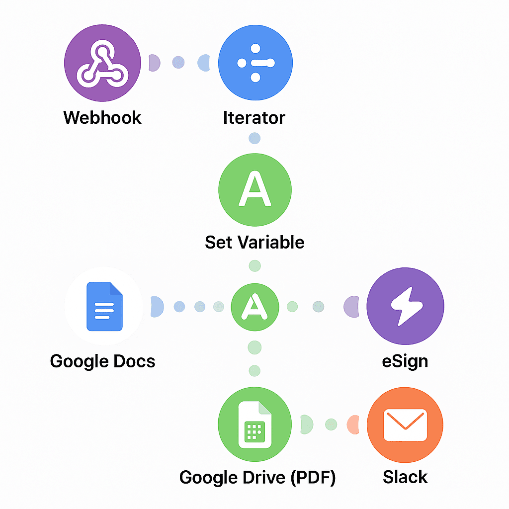 Automatyzacja Podpisywanie umów (Docs → eSign) umożliwia szybkie tworzenie, wysyłanie i podpisywanie dokumentów bez udziału człowieka. System automatycznie generuje umowę z szablonu Google Docs, konwertuje ją do PDF i wysyła do podpisu przez DocuSign, HelloSign lub SignNow. Po podpisaniu, dokument trafia do Google Drive lub CRM i wysyłane jest powiadomienie. Wszystko odbywa się w pełni automatycznie, zgodnie z RODO i eIDAS. Idealne dla agencji, software house’ów i firm B2B.