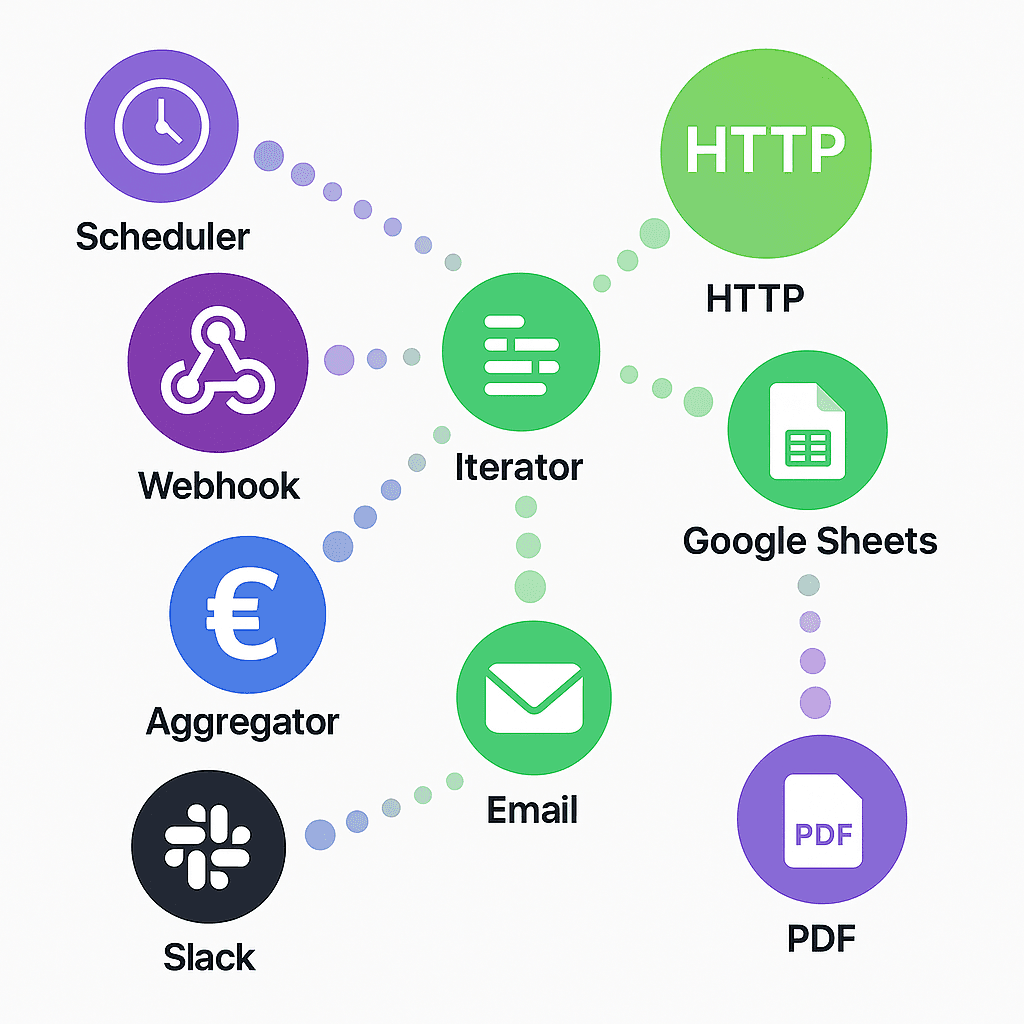 Scenariusz pobiera dane o trasach i tankowaniach z różnych źródeł — takich jak GPS, CRM, Google Sheets lub ERP — przelicza zużycie paliwa, koszt na 100 km, łączny koszt floty i średnie spalanie, a następnie tworzy gotowy raport w formacie Google Sheets lub PDF.